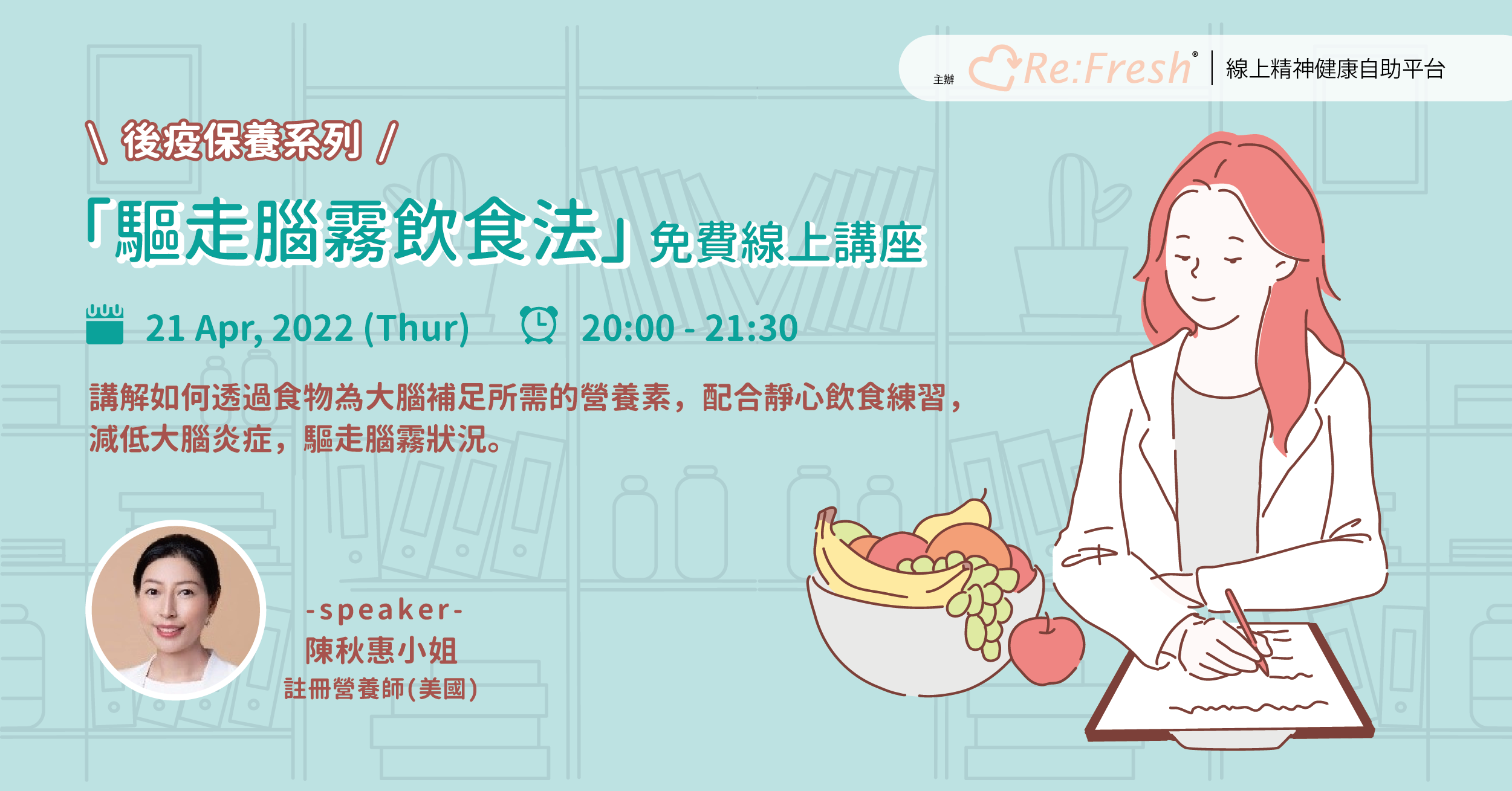 進入後疫時期,越來越多曾受感染的人士出現「腦霧」(Brain fog) 的後遺反應,專注力不集中可算是最普遍的症狀之一,大大影響工作效率及生活質素。本活動將由營養師親自講解如何透過食物為大腦補足所需的營養素,配合靜心飲食練習,減低大腦炎症,驅走腦霧狀況。